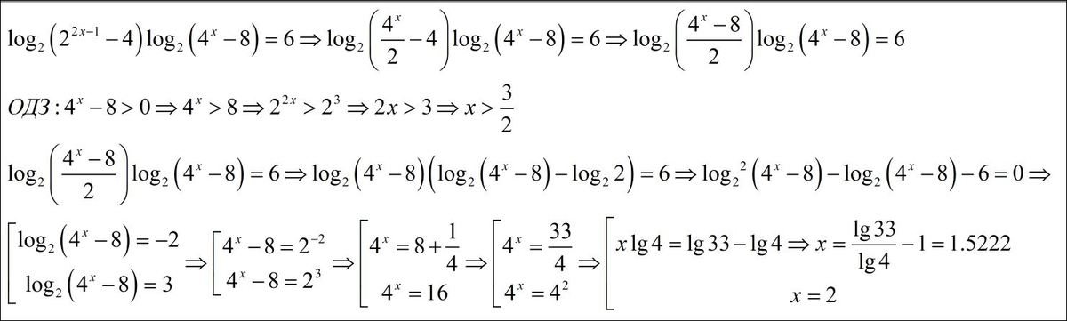 $(log(2)(4^x-8)-1)*log(2)(4^x-8)=6$