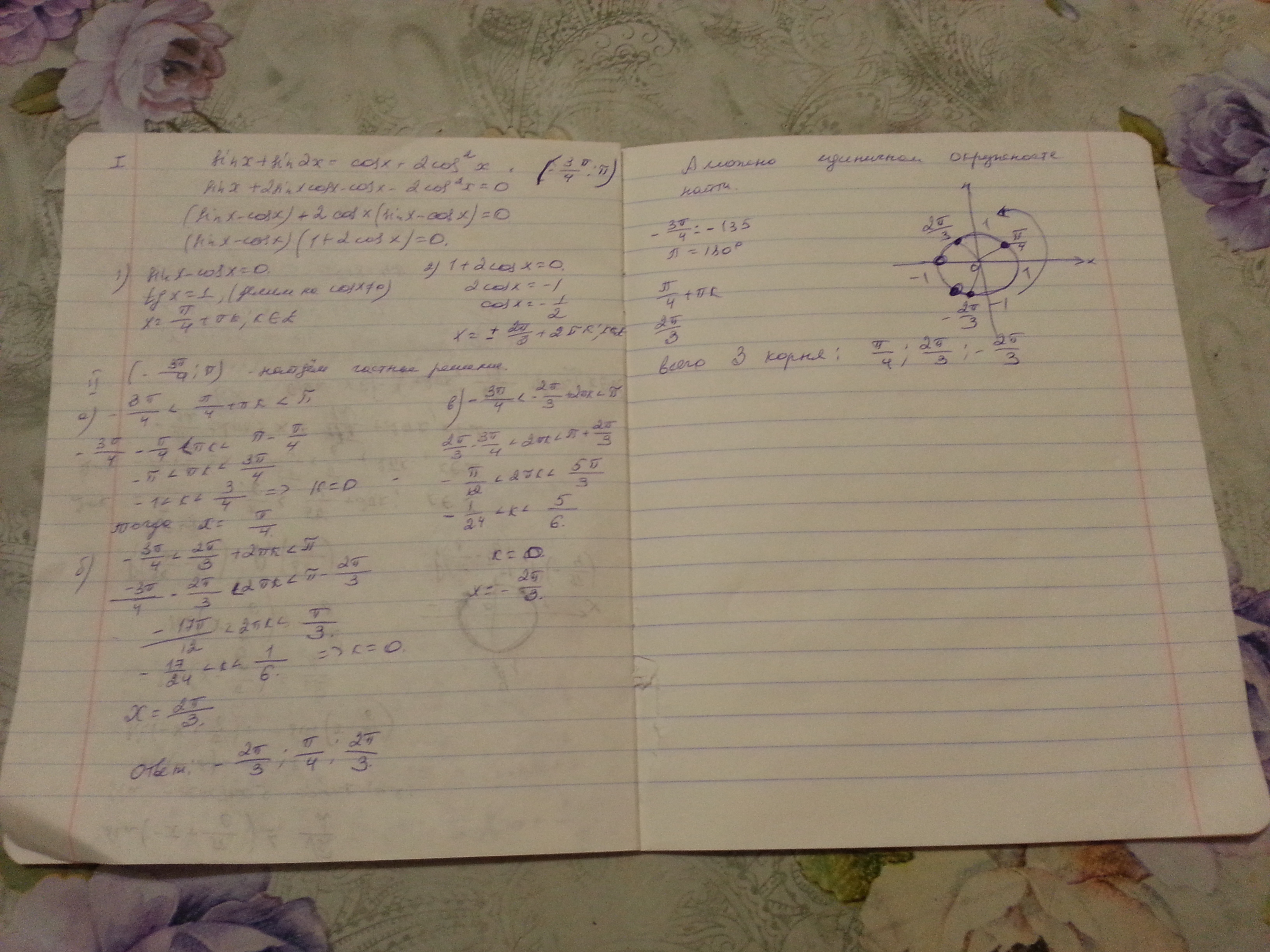 Перед вами страница с вопросом Найдите корни уравнения sin x + sin 2x = cos x + 2 cos ^ 2x, принадлежащие полуинтервалу ( - 3П / 4 ; П)?, который относится к категории Алгебра. Уровень сложности соответствует учебной программе для учащихся 10 - 11 классов. Здесь вы найдете не только правильный ответ, но и сможете ознакомиться с вариантами пользователей, а также обсудить тему и выбрать подходящую версию. Если среди найденных ответов не окажется варианта, полностью раскрывающего тему, воспользуйтесь «умным поиском», который откроет все похожие ответы, или создайте собственный вопрос, нажав кнопку в верхней части страницы.