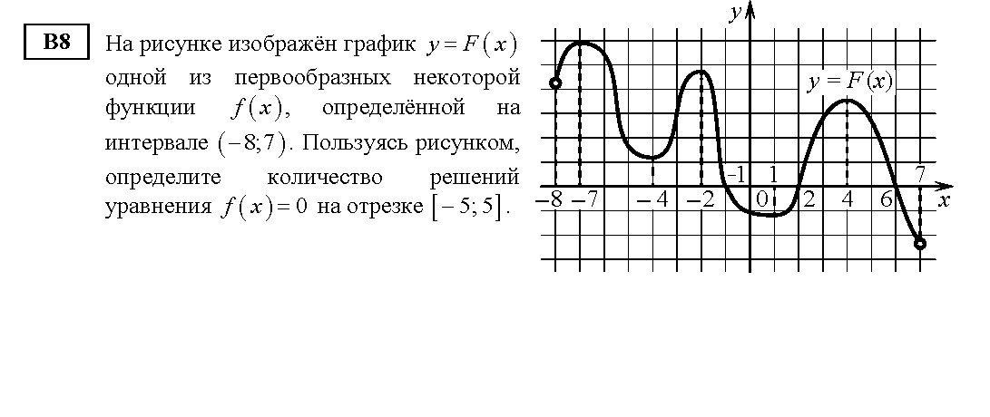 Производная равна 0, когда касательная к графику параллельная оси абсцисс, такие касательные в точках - 7, - 4, - 2, 1, 4 - 5 решений, но в отрезок попадают только 4