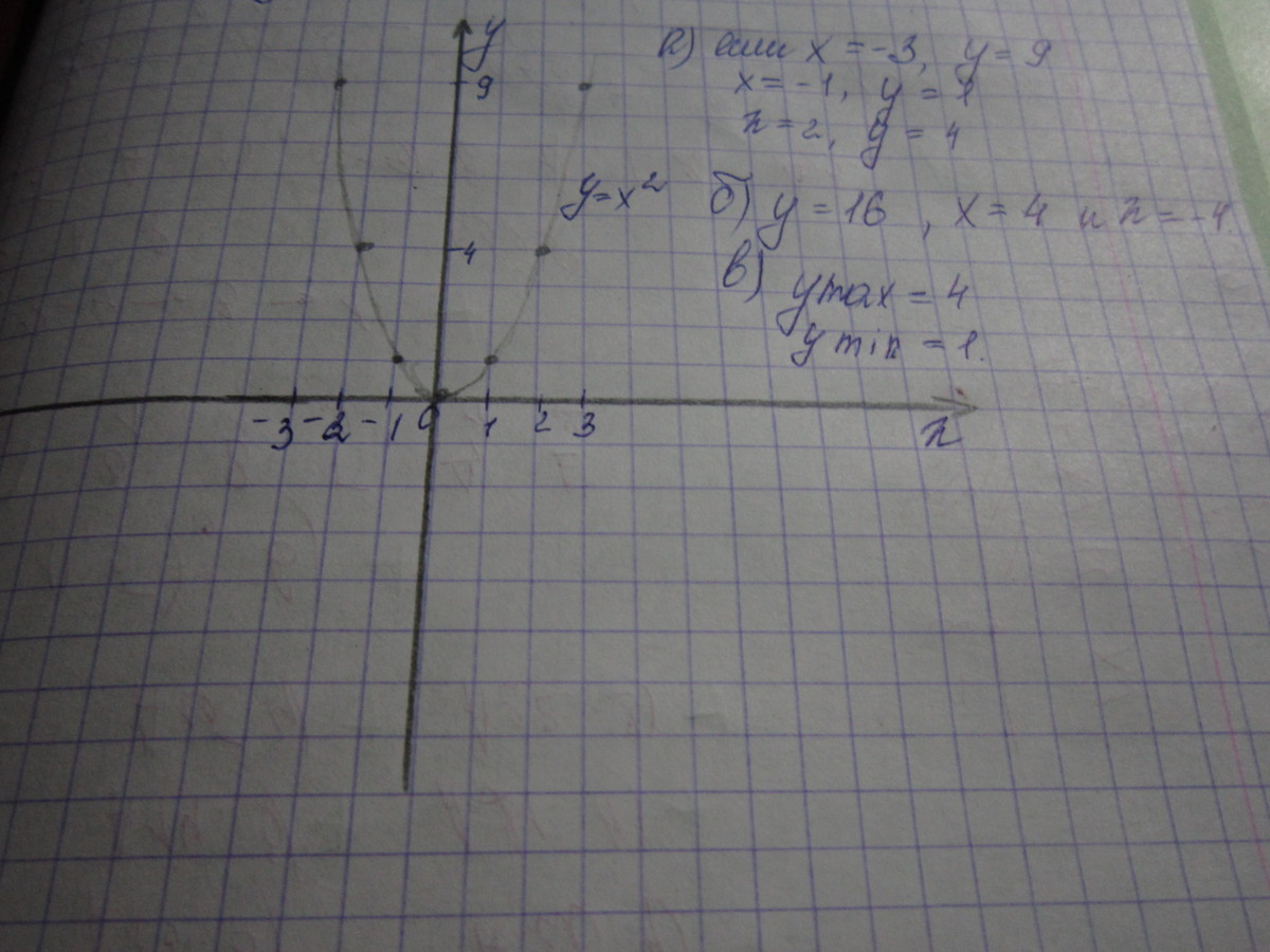 Постройте график функции y = x ^ 2С помощью графика найдите :а) Значения функции при значении аргумента, равном - 3 ; - 1 ; 2б) значения аргумента, если значение функции равно - 9в) Наибольшее и наиме?