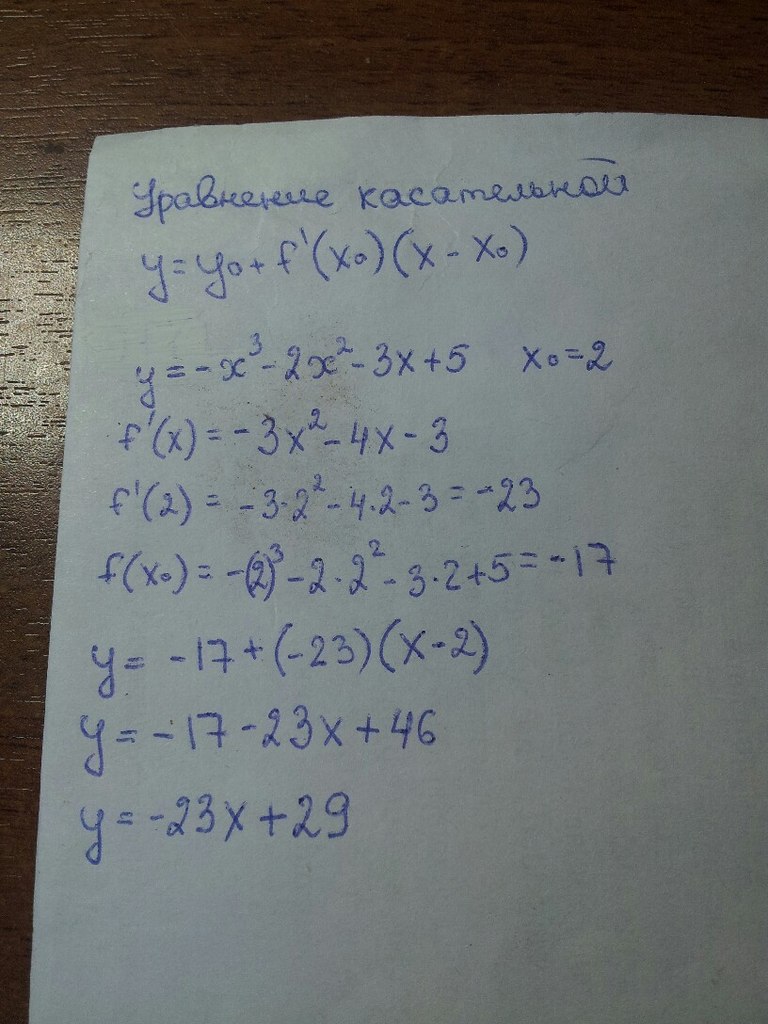 Вы перешли к вопросу Составьте уравнение касательной к графику функции y = - x ^ 3 - 2x ^ 2 - 3x + 5 в точке с абсциссой x = 2?. Он относится к категории Алгебра, для 10 - 11 классов. Здесь размещен ответ по заданным параметрам. Если этот вариант ответа не полностью вас удовлетворяет, то с помощью автоматического умного поиска можно найти другие вопросы по этой же теме, в категории Алгебра. В случае если ответы на похожие вопросы не раскрывают в полном объеме необходимую информацию, то воспользуйтесь кнопкой в верхней части сайта и сформулируйте свой вопрос иначе. Также на этой странице вы сможете ознакомиться с вариантами ответов пользователей.