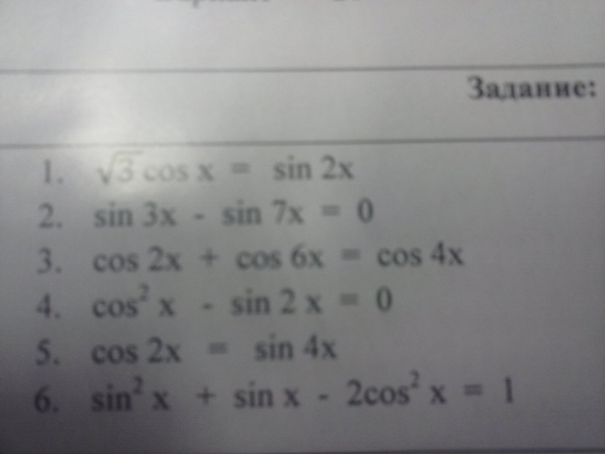 1. $\sqrt{3} \cos x=\sin 2x \\\ \sqrt{3} \cos x=2\sin x\cos x \\\ \sqrt{3} \cos x-2\sin x\cos x=0 \\\ \cos x( \sqrt{3} -2\sin x)=0 \\\ \cos x=0; \ x_1= \frac{ \pi }{2} + \pi n, \ n\in Z \\\ \sqrt{3} -2\sin x=0; \ \sin x= \frac{ \sqrt{3} }{2} ; \ x_2=(-1)^k \frac{ \pi }{3} + \pi k, \ k\in Z$