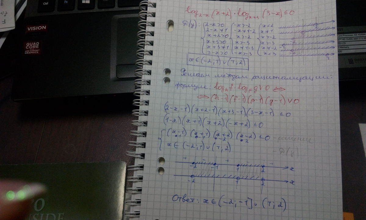 Помогите решить неравенство с логарифмом log 2 - x (x + 2) * log x + 3 (3 - x)< ; = 0.
