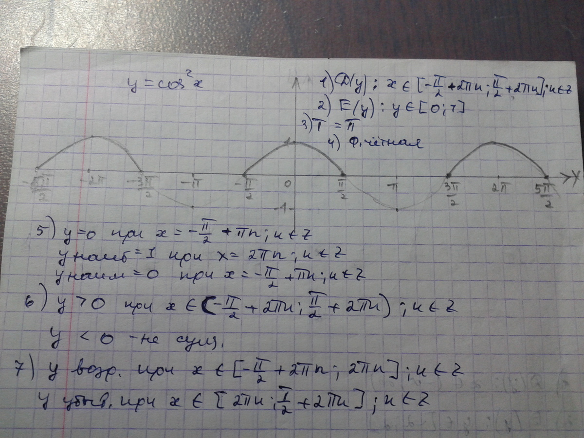 На этой странице сайта вы найдете ответы на вопрос Построить график функции y = cos ^ 2 x и указать её свойства?, относящийся к категории Алгебра. Сложность вопроса соответствует базовым знаниям учеников 10 - 11 классов. Для получения дополнительной информации найдите другие вопросы, относящимися к данной тематике, с помощью поисковой системы. Или сформулируйте новый вопрос: нажмите кнопку вверху страницы, и задайте нужный запрос с помощью ключевых слов, отвечающих вашим критериям. Общайтесь с посетителями страницы, обсуждайте тему. Возможно, их ответы помогут найти нужную информацию.