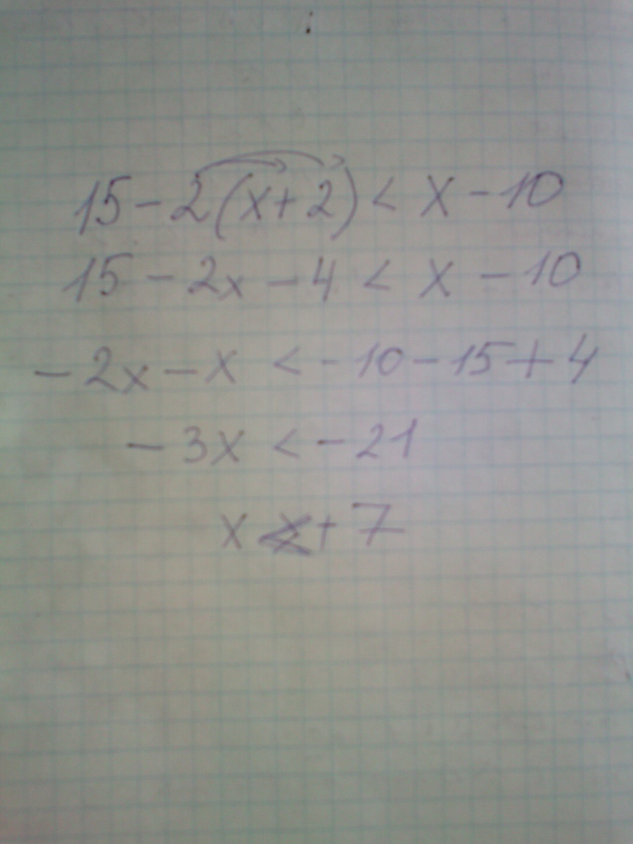 Найти наименьшее целое число, являющееся решением неравенства 15 - 2(х + 2)< ; х - 10 Помогите пожалуйста))).