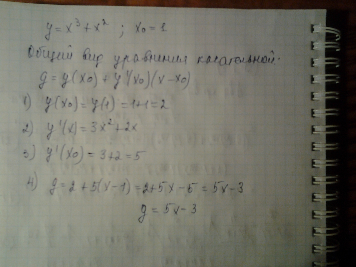На этой странице вы найдете ответ на вопрос Составить уравнение касательной к графику функции y = x3 + x2 в точке с абсциссой хо = 1?. Вопрос соответствует категории Алгебра и уровню подготовки учащихся 10 - 11 классов классов. Если ответ полностью не удовлетворяет критериям поиска, ниже можно ознакомиться с вариантами ответов других посетителей страницы или обсудить с ними интересующую тему. Здесь также можно воспользоваться «умным поиском», который покажет аналогичные вопросы в этой категории. Если ни один из предложенных ответов не подходит, попробуйте самостоятельно сформулировать вопрос иначе, нажав кнопку вверху страницы.