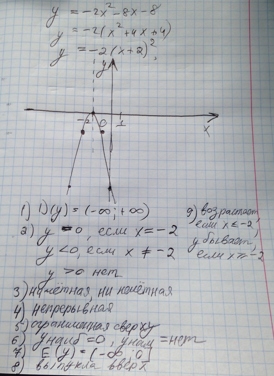 Построить график функции и установить ёё свойства : минус два икс квадрат минус восемь икс минусвосемь?