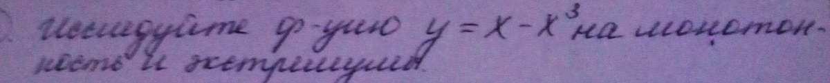 $y=x-x^3\\\\y'=1-3x^2=0\; ,\; \; (1-\sqrt3x)(1+\sqrt3x)=0\\\\x_1=-\frac{1}{\sqrt3}\; ,\; x_2=\frac{1}{\sqrt3}\\\\Znaki\; \; y':\; \; ---(-\frac{1}{\sqrt3})+++(\frac{1}{\sqrt3})---\\\\y(x)\; vozrastaet:\; (-\frac{1}{\sqrt3},\frac{1}{\sqrt3})\\\\y(x) \; ybuvaet:\; (-\infty,-\frac{1}{\sqrt3})\; ,(\frac{1}{\sqrt3},+\infty)\\\\x_{min}=-\frac{1}{\sqrt3}\; ,\; y_{min}=-\frac{1}{\sqrt3}+\frac{1}{3\sqrt3}=-\frac{2}{3\sqrt3}\\\\x_{max}=\frac{1}{\sqrt3}\; ,y_{max}=\frac{1}{\sqrt3}-\frac{1}{3\sqrt3}=\frac{2}{3\sqrt3}$.