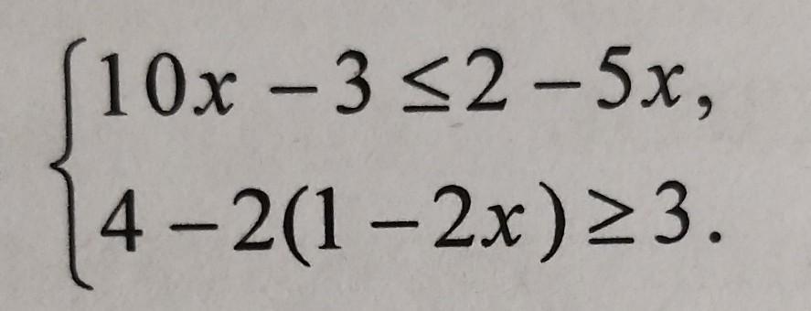 $10x - 3 \leqslant 2 - 5x \\ 4 - 2(1 - 2x) \geqslant 3 \\ \\ 15x \leqslant 5 \\ 4x \geqslant 1 \\ \\ x \leqslant \frac{1}{3} \\ x \geqslant \frac{1}{4}$
