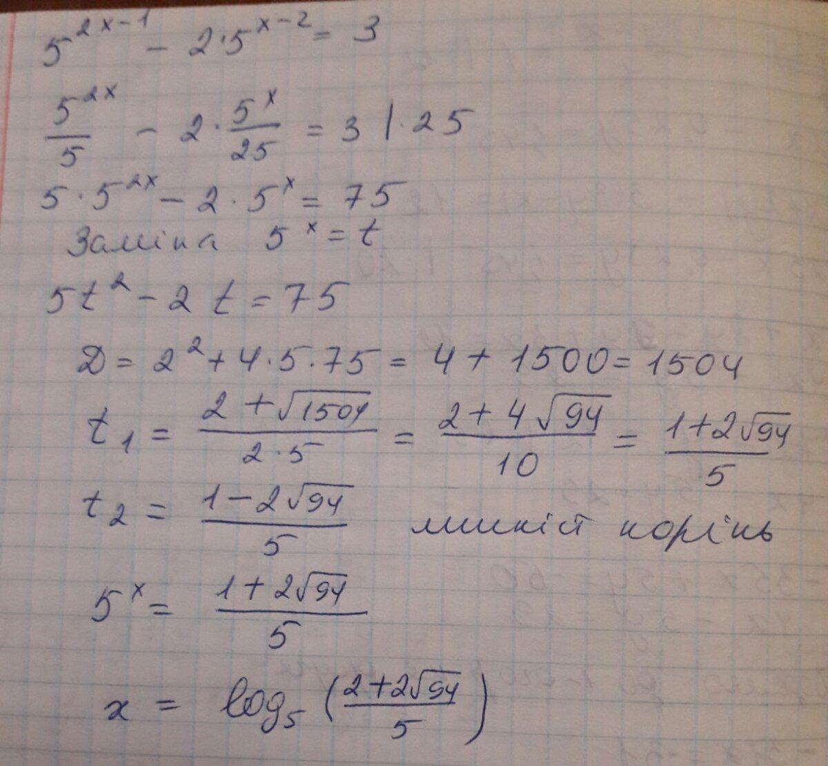 $5 ^ {2x - 1} - 2 * 5 ^ {x - 2} = 3$