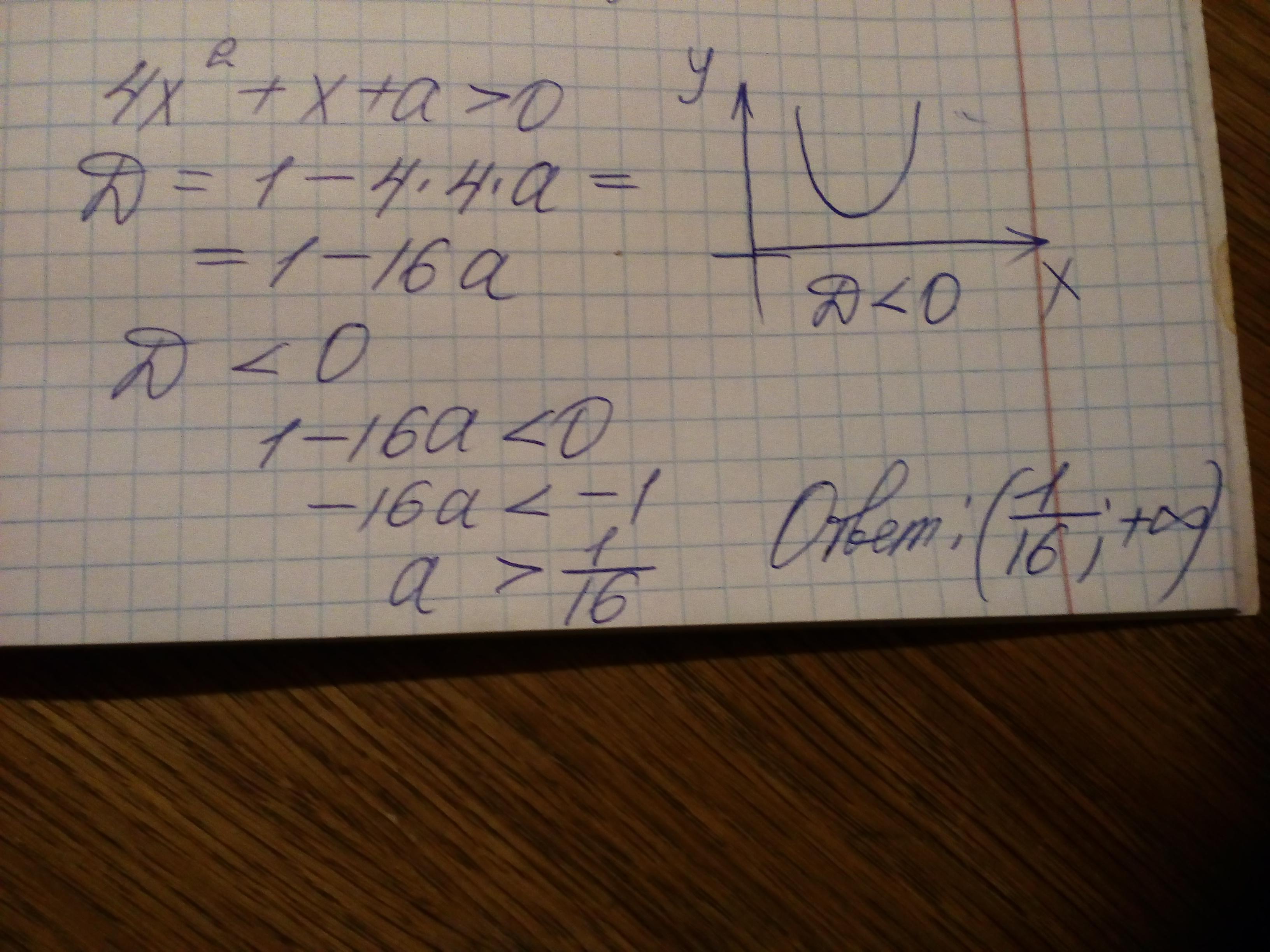 Найти все значения параметра a, при которых выполняется неравенство 4x ^ 2 + x + a > ; 0 при любом значении x.