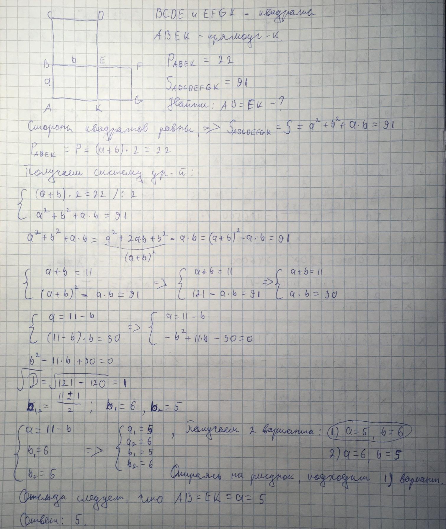Площадь этой составной фигуры (два квадрата и прямоугольник) составляет 91 кв.