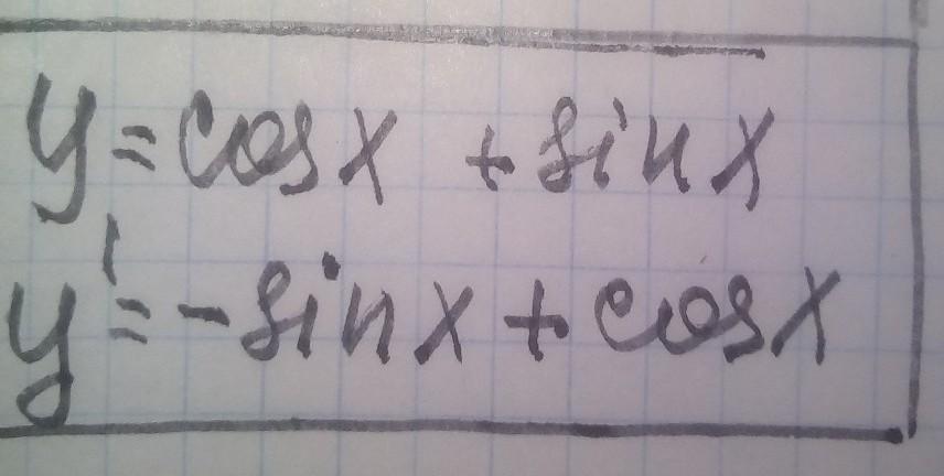 Вы зашли на страницу вопроса Знайдіть похідну функції y = cos x + sin x?, который относится к категории Алгебра. По уровню сложности вопрос соответствует учебной программе для учащихся 5 - 9 классов. В этой же категории вы найдете ответ и на другие, похожие вопросы по теме, найти который можно с помощью автоматической системы «умный поиск». Интересную информацию можно найти в комментариях-ответах пользователей, с которыми есть обратная связь для обсуждения темы. Если предложенные варианты ответов не удовлетворяют, создайте свой вариант запроса в верхней строке.