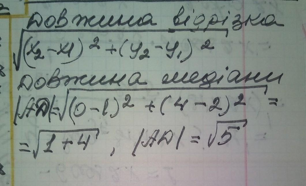 Если вам необходимо получить ответ на вопрос Знайти довжину медіани AD трикутника ABC, якщо A(1 ; 2) B(3 : 5) C( - 3 ; 3)?, относящийся к уровню подготовки учащихся студенческий, вы открыли нужную страницу. В категории Алгебра вы также найдете ответы на похожие вопросы по интересующей теме, с помощью автоматического «умного» поиска. Если после ознакомления со всеми вариантами ответа у вас остались сомнения, или полученная информация не полностью освещает тематику, создайте свой вопрос с помощью кнопки, которая находится вверху страницы, или обсудите вопрос с посетителями этой страницы.