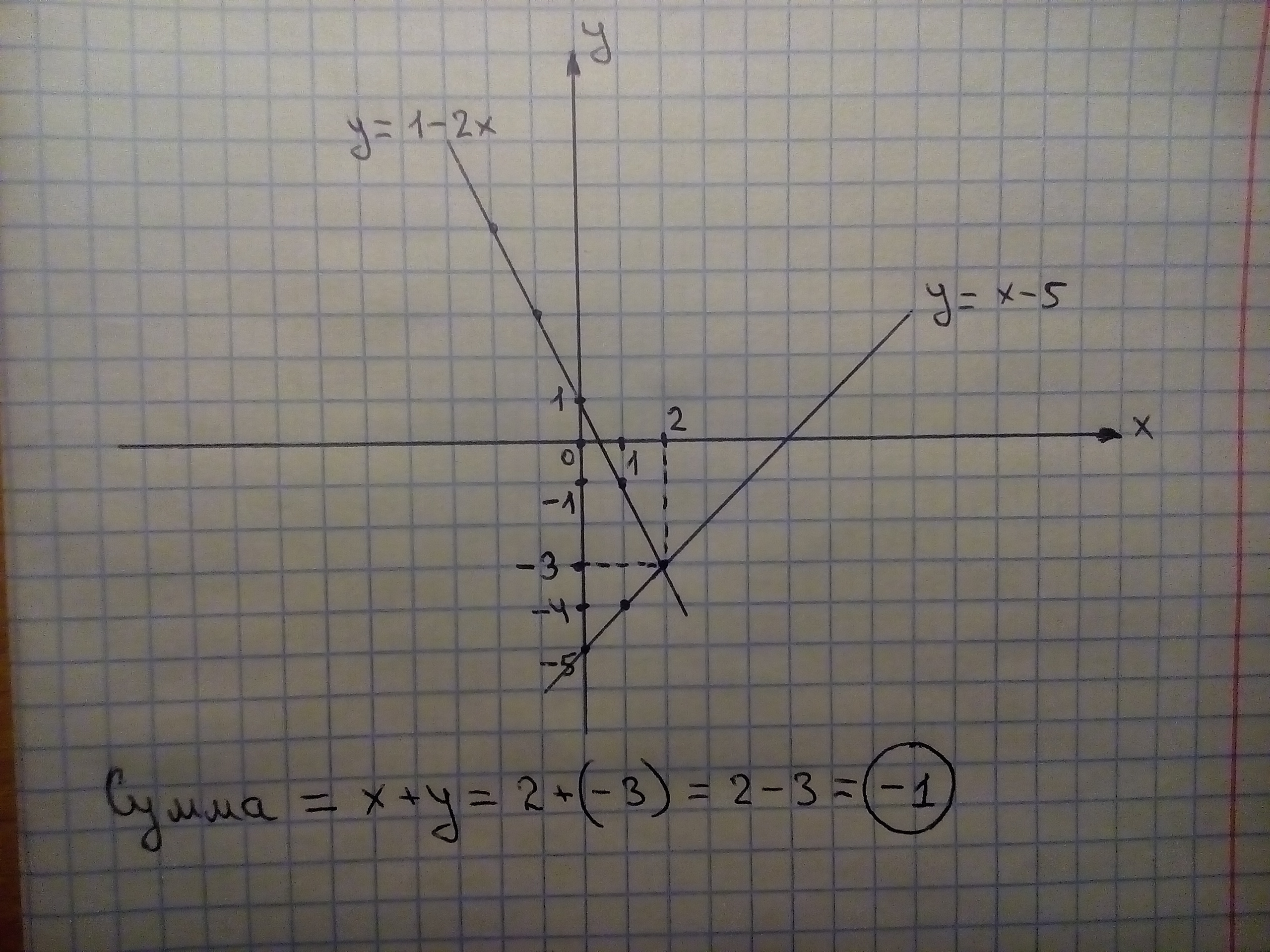 Выполняя построения вычислите сумму абсцисса и ордината точки пересечения графиков функции у = 1 - 2х и у = х - 5.