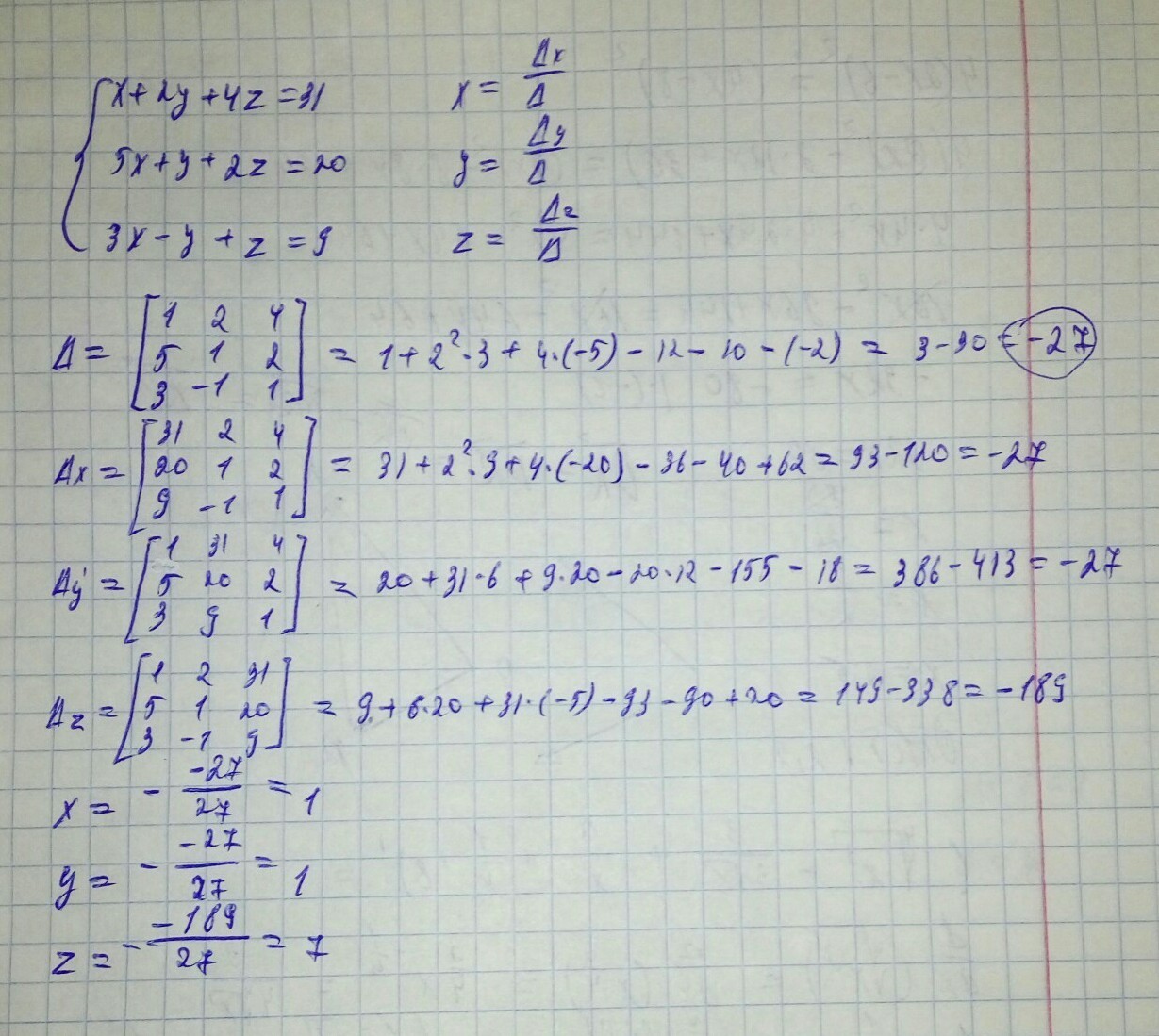 Решить систему линейных уравнений с тремя неизвестными по формулам Крамера.