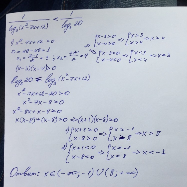 log3 (x ^ 2 - 7x + 12) > ; log3 20.