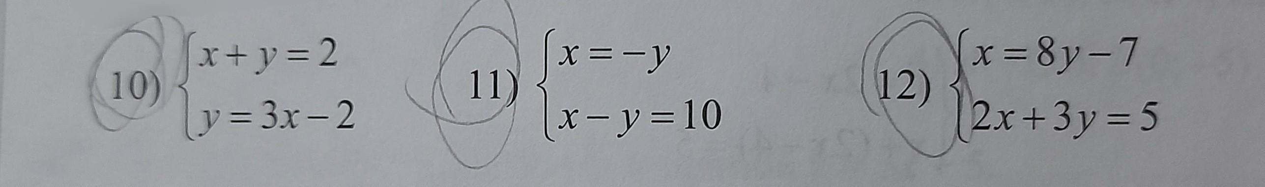 $\displaystyle\bf\\1)\\\\\left \{ {{x+y=2} \atop {y=3x-2}} \right. \\\\\\\left \{ {{x+3x-2=2} \atop {y=3x-2}} \right. \\\\\\\left \{ {{4x=4} \atop {y=3x-2}} \right. \\\\\\\left \{ {{x=1} \atop {y=3\cdot 1-2}} \right. \\\\\\\left \{ {{x=1} \atop {y=1}} \right. \\\\\\Otvet \ : \ (1 \ ; \ 1)\\\\2)\\\\\left \{ {{x=-y} \atop {x-y=10}} \right. \\\\\\\left \{ {{x=-y} \atop {-y-y=10}} \right. \\\\\\\left \{ {{x=-y} \atop {-2y=10}} \right.$