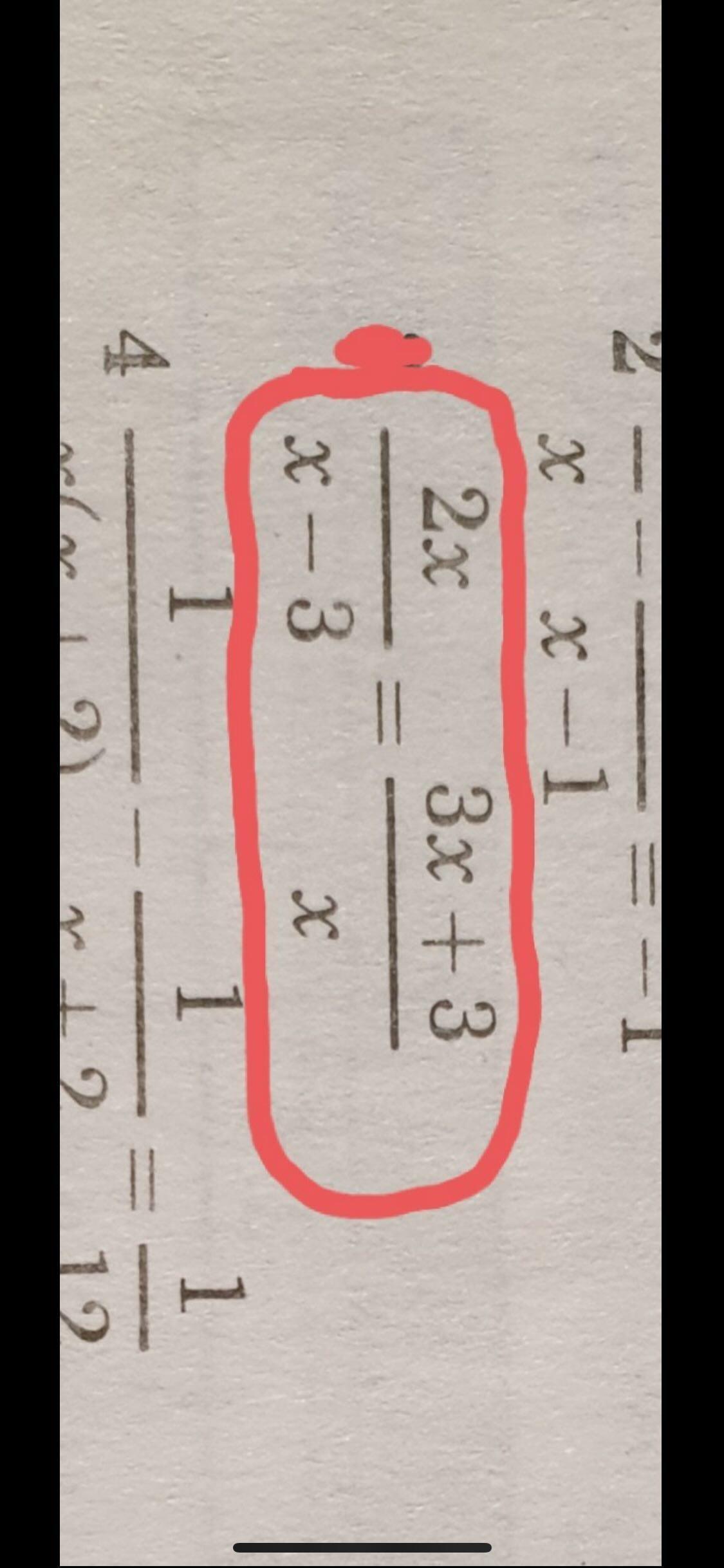$\displaystyle\bf\\\frac{2x}{x-3}=\frac{3x+3}{x} \\\\\\\frac{2x}{x-3}-\frac{3x+3}{x}=0\\\\\\\frac{2x\cdot x-(3x+3)\cdot(x-3)}{x(x-3)} =0\\\\\\\frac{2x^{2} -3x^{2} +9x-3x+9}{x(x-3)} =0\\\\\\\frac{-x^{2} +6x+9}{x(x-3)}=0\\\\\\-x^{2} +6x+9=0 \ \ ; \ \ x\neq 0 \ \ , \ \ x-3\neq 0\\\\\\x^{2} -6x-9=0 \ \ ; \ \ x \neq 0 \ \ ; \ \ x\neq 3\\\\\\D=(-6)^{2}-4\cdot (-9)= 36+36=72=(6\sqrt{2} )^{2}$