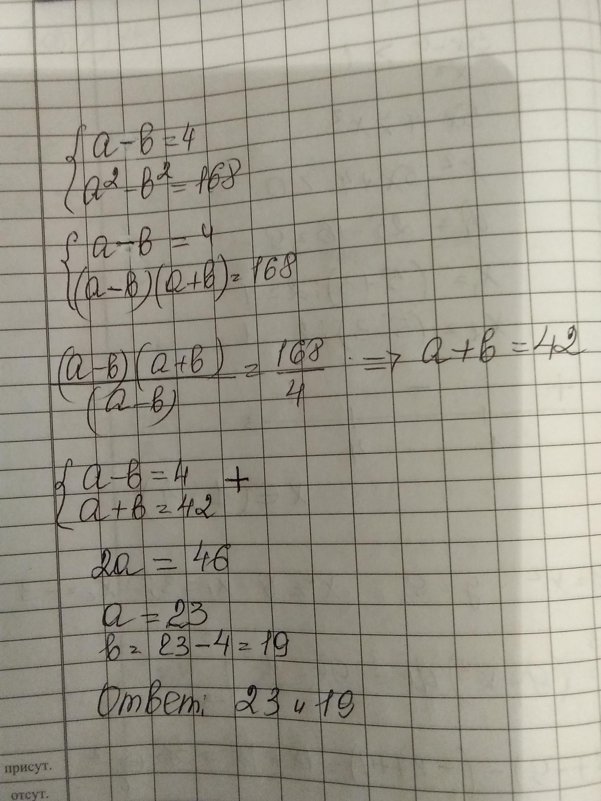Разность двух чисел равна 4, а разность их квадратов - 168 найдите эти числа.