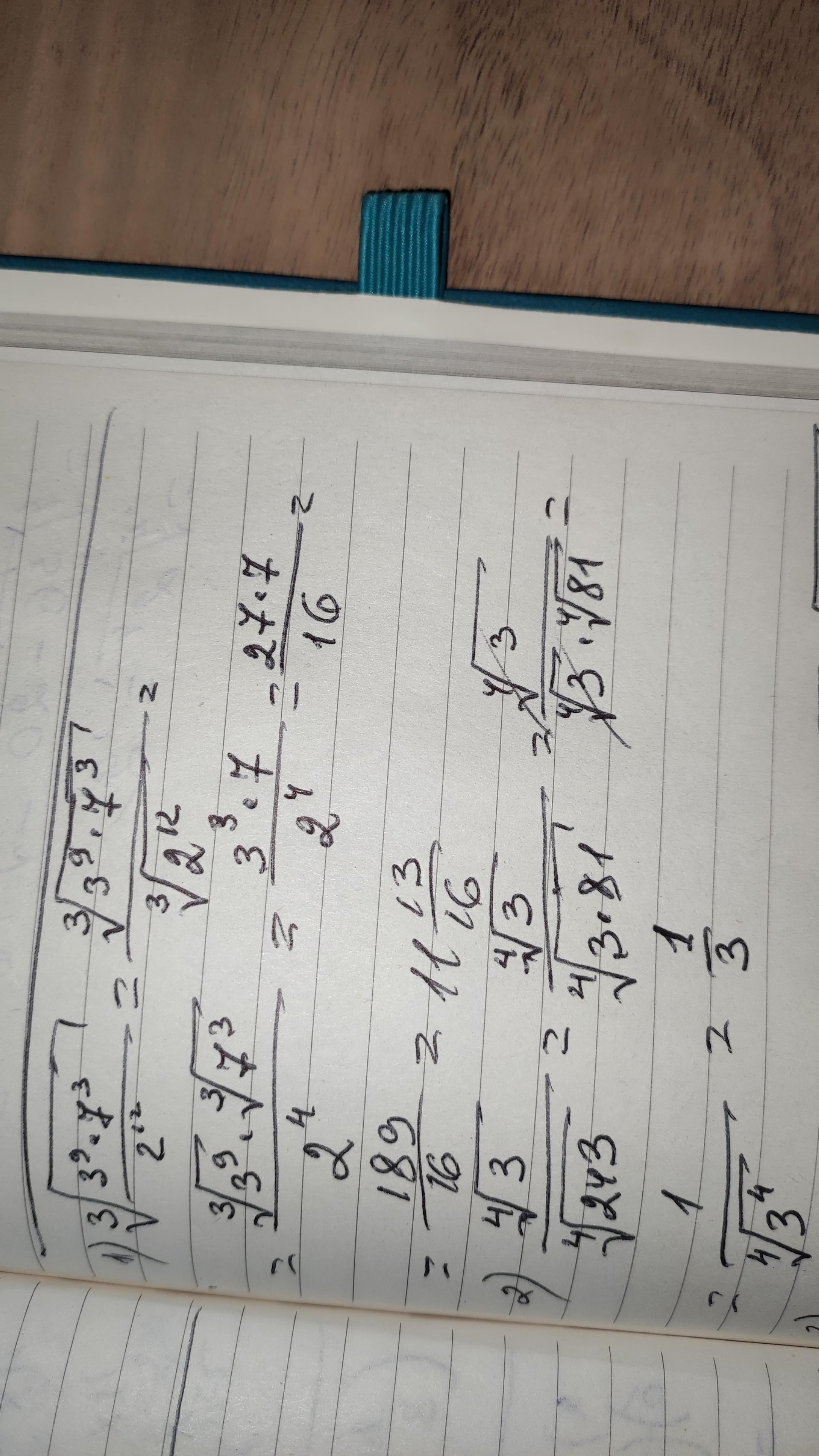 $\displaystyle\bf\\1)\\\\\sqrt[3]{\frac{3^{9} \cdot 7^{3} }{2^{12} } } =\sqrt[3]{\frac{(3^{3})^{3}\cdot 7^{3}}{(2^{4})^{3} } } =\frac{3^{3} \cdot 7}{2^{4} } =\frac{27\cdot 7}{16} =11,8125\\\\\\2)\\\\\frac{\sqrt[4]{3} }{\sqrt[4]{243} } =\sqrt[4]{\frac{3}{243} } =\sqrt[4]{\frac{1}{81} } =\sqrt[4]{\Big(\frac{1}{3}\Big)^{4} } =\frac{1}{3} \\\\\\3)\\\\\sqrt[4]{6-2\sqrt{5} } \cdot\sqrt[4]{6+2\sqrt{5} } =\sqrt[4]{(6-2\sqrt{5} )\cdot(6+2\sqrt{5} )} =$