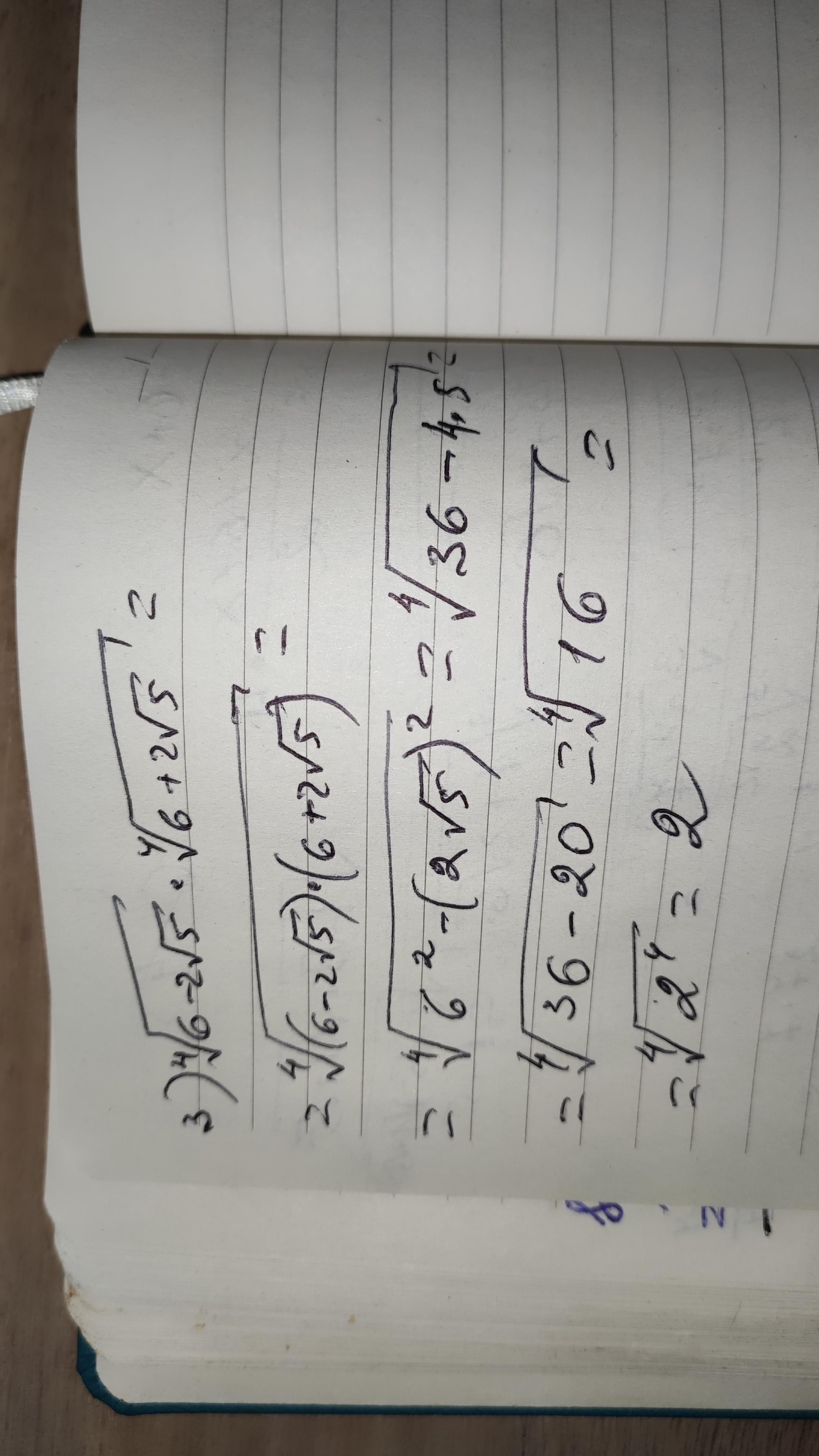 $\displaystyle\bf\\=\sqrt[4]{6^{2} -(2\sqrt{5} )^{2} } =\sqrt[4]{36-20}=\sqrt[4]{16} =\sqrt[4]{2^{4} } =2$.