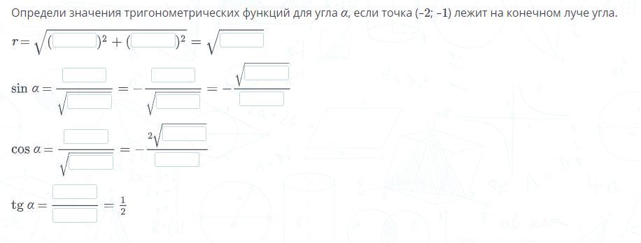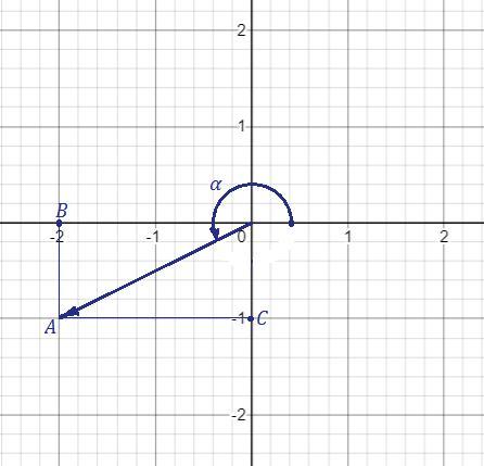$A(-2;-1)\ \ ,\ \ \ r=|OA|\ \ ,\ \ |OB|=2\ \ ,\ \ |AB|=|OC|=1\\\\r=\sqrt{2^2+1^2}=\sqrt5\\\\sin\alpha =sin(180^\circ +\angle AOB)=-sin\angle AOB=-\dfrac{|AB|}{r}=-\dfrac{1}{\sqrt5}\\\\cos\alpha =cos(180^\circ +\angle AOB)=-cos\angle AOB=-\dfrac{|OB|}{r}=-\dfrac{2}{\sqrt5}\\\\tg(180^\circ +\angle AOB)=tg\angle AOB=\dfrac{|AB|}{|OB|}=\dfrac{1}{2}$.