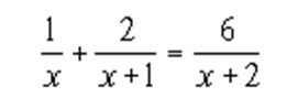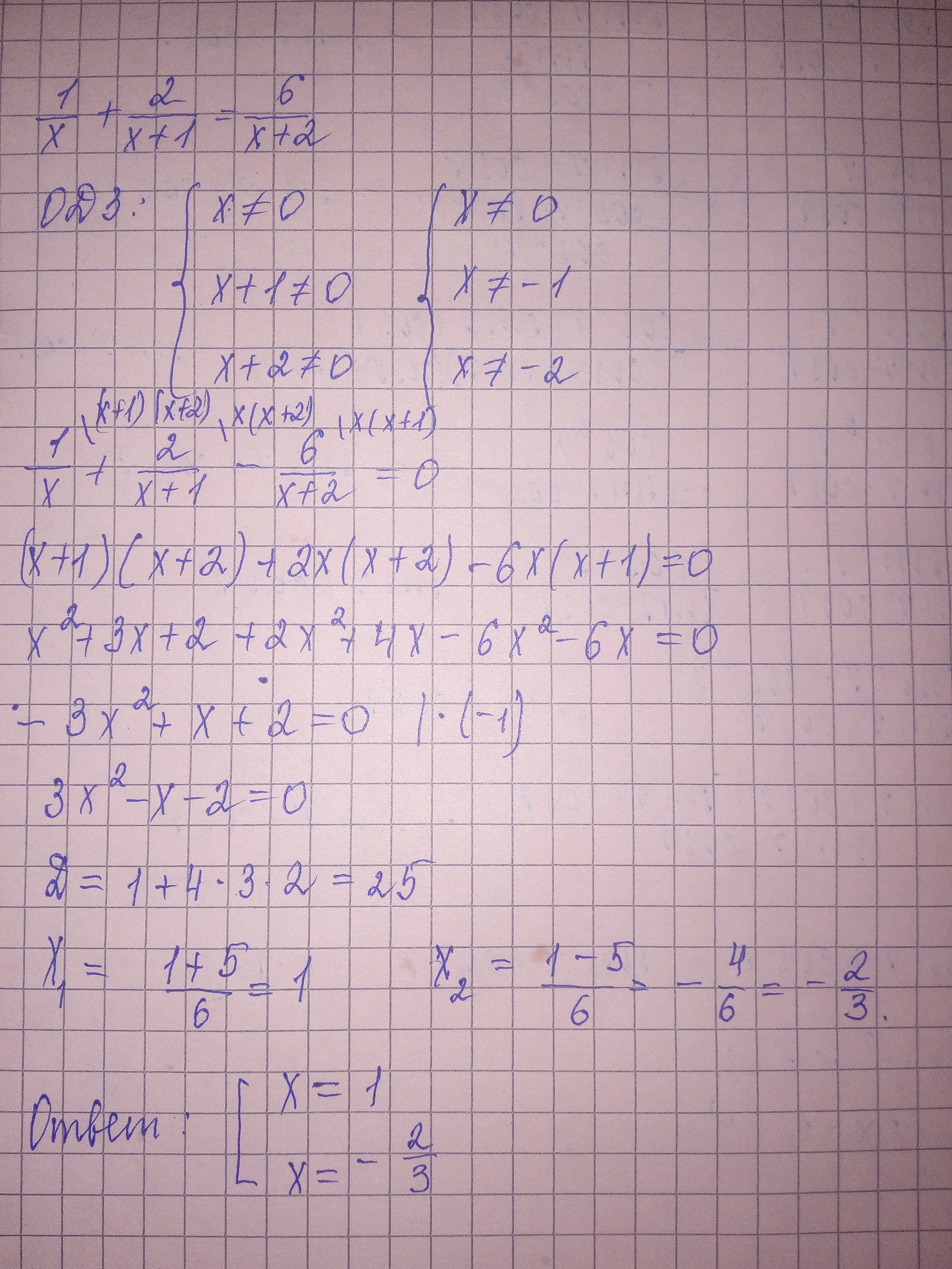 $\frac{1}{x}+\frac{2}{x+1} -\frac{6}{x+2}=0\\\\\frac{(x+1)(x+2)+2x(x+2)-6x(x+1)}{x(x+1)(x+2)}=0\\\\\frac{x^{2}+3x+2+2x^{2}+4x-6x^{2}-6x}{x(x+1)(x+2)} =0\\\\\frac{-3x^{2}+x+2 }{x(x+1)(x+2)}=0\\\\\left \{ {{3x^{2}-x-2=0 } \atop {x\neq0;x\neq-1;x\neq-2}} \right.\\\\3x^{2} -x-2=0\\\\D=(-1)^{2}-4*3*(-2)=1+24=25=5^{2}\\\\x_{1}=\frac{1+5}{6}=1\\\\x_{2}=\frac{1-5}{6}=-\frac{4}{6}=-\frac{2}{3}$.