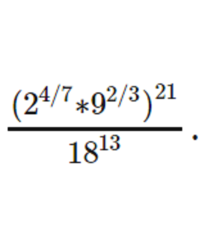 $\frac{ (2^{ \frac{4}{7} } * 9^{ \frac{2}{3} })^{21} }{ 18^{13} } = \frac{ 2^{ \frac{4}{7}*21 } * 9^{ \frac{2}{3}*21 } }{ (2*9)^{13} } = \frac{ 2^{12 } * 9^{ 14 } }{ 2^{13}*9^{13} } = 2^{12-13} * 9^{14-13} = 2^{-1} *9= \frac{1}{2} *9=$